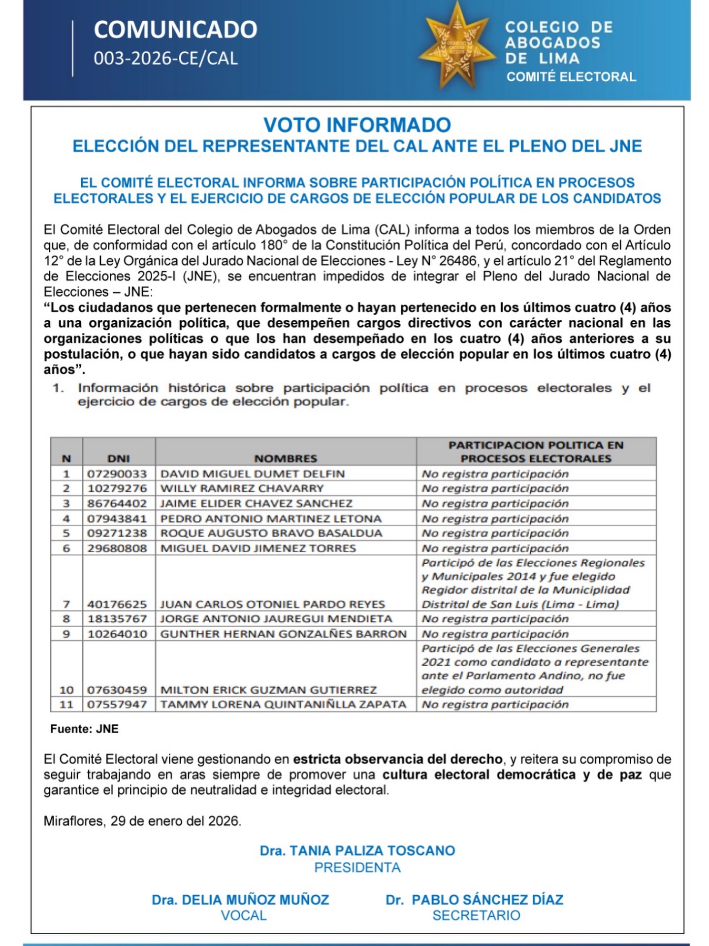 Ahora bien, mediante un comunicado, el Comité Electoral del CAL anunció que, conforme a sus estatutos, se elegirá al representante del gremio ante el JNE el domingo 15 de febrero , mediante el clásico voto presencial .