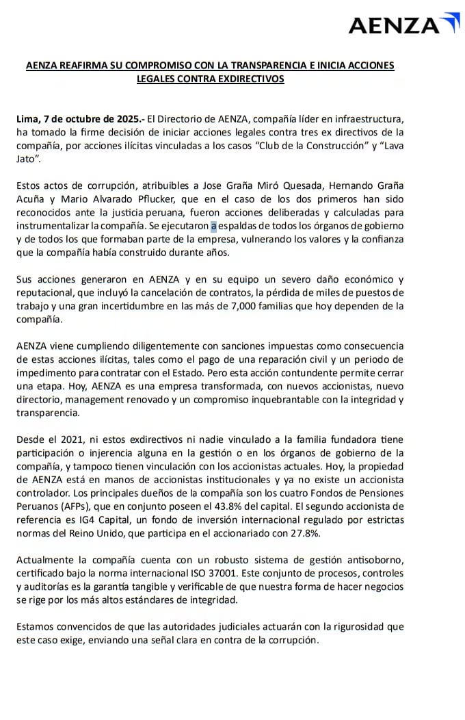 Lima, 7 de octubre de 2025.- El Directorio de AENZA, compañía líder en infraestructura, ha tomado la firme decisión de iniciar acciones legales contra tres ex directivos de la compañía, por acciones ilícitas vinculadas a los casos «Club de la Construcción» y «Lava Jato».
