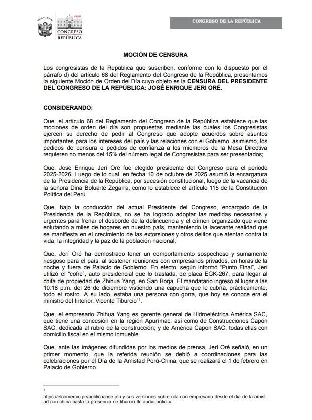 La moción recuerda que, tras la vacancia de Dina Boluarte Zegarra por incapacidad moral permanente aprobada el 10 de octubre de 2025, José Jerí Oré asumió la Presiden conforme al artículo 115 de la Constitución. Asimismo, se señala:
