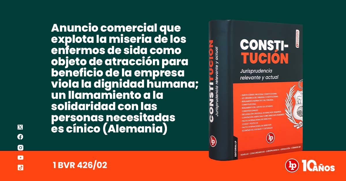 Fundamentos destacados: 25. b) Basándose en este análisis, el Tribunal Federal de Justicia concluye en su apreciación que el anuncio vulnera la dignidad humana debido a su finalidad. La publicidad que llama la atención y explota la miseria de los afectados como objeto de atracción para su propio beneficio comercial es incompatible con el artículo 1, apartado 1, de la Ley Fundamental. Un llamamiento a la solidaridad con las personas necesitadas es cínico y viola su derecho al respeto y a la solidaridad humana por su propio bien si se combina con el interés comercial de aumentar el propio volumen de negocios de la empresa en un ámbito completamente distinto.