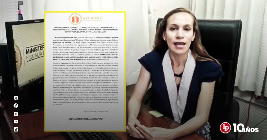 La Asociación de Fiscales del Perú solicitó a la Comandancia General de la Policía Nacional disponer de manera inmediata el resguardo policial para Evelyn La Madrid Bances. La fiscal provincial de la Fiscalía Especializada en Materia Ambiental del Distrito Fiscal del Santa habría recibido amenazas de muerte dirigidas también contra su esposo e hijos menores.