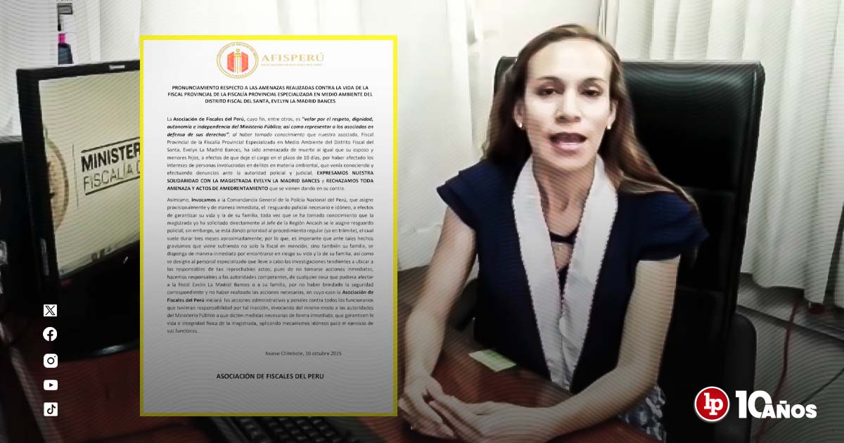 En un pronunciamiento oficial, el gremio expresó su rechazo frente a los actos de amedrentamiento contra la magistrada y demandó medidas urgentes para garantizar su seguridad. «Expresamos nuestra solidaridad con la magistrada Evelyn La Madrid Bances y rechazamos toda amenaza y actos de amedrentamiento que se vienen dando en su contra», indicó la Asociación de Fiscales.