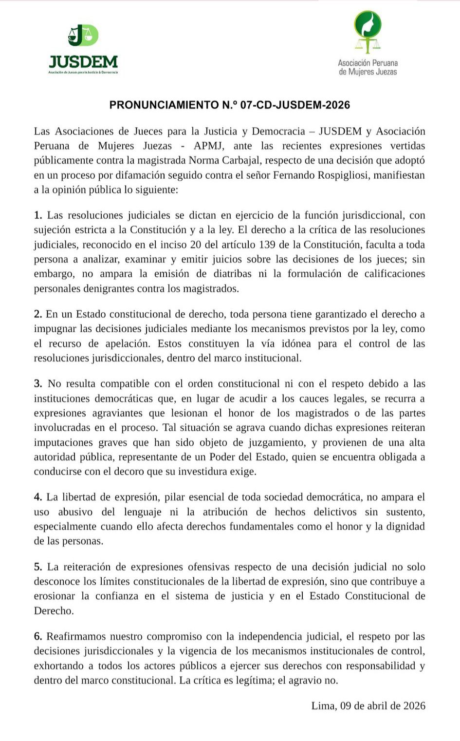Las Asociaciones de Jueces para la Justicia y Democracia – JUSDEM y Asociación Peruana de Mujeres Juezas – APMJ, ante las recientes expresiones vertidas públicamente contra la magistrada Norma Carbajal, respecto de una decisión que adoptó en un proceso por difamación seguido contra el señor Fernando Rospigliosi, manifiestan a la opinión pública lo siguiente: