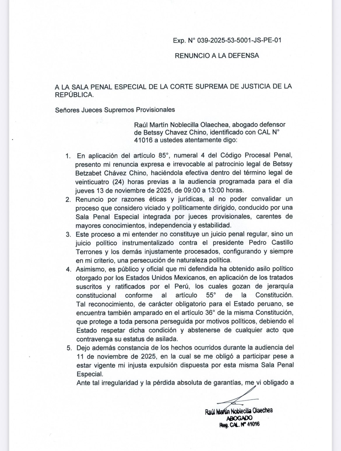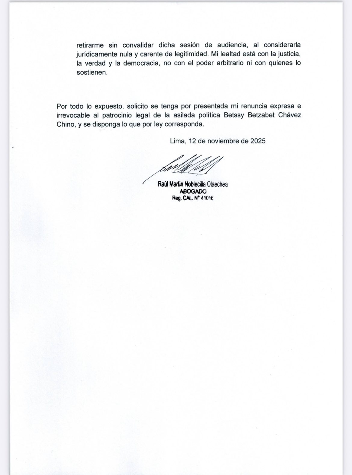 En esta carta, en la que también subroga a César Romero y a Luis Barranzuela, y en la que también renuncia a ejercer su propia defensa, nombró a Noblecilla como su único abogado. De acuerdo con Chávez Chino, este último letrado «goza de mi total confianza y [es] en quien deposito plenamente mi representación y defensa».