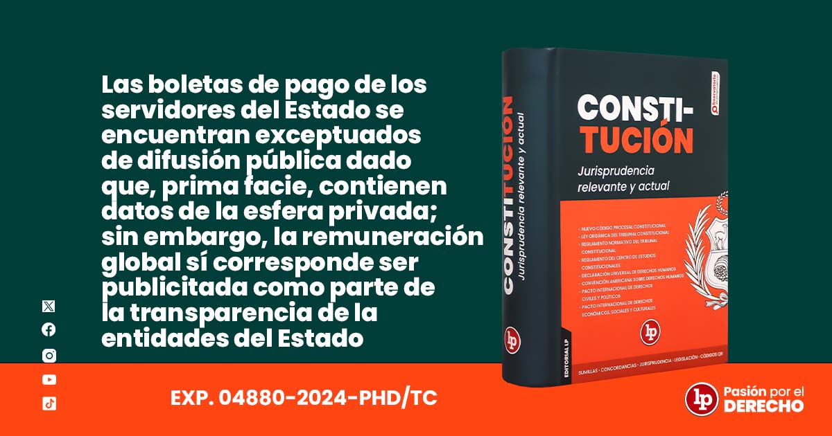 Fundamento destacado: 6. Sin perjuicio de lo antes expuesto, resulta pertinente precisar que en jurisprudencia emitida por este colegiado[11], se ha precisado que las boletas de pago de los servidores del Estado se encuentran exceptuados de su difusión pública por mandato del artículo 15-B de la Ley 27806, dado que los datos contenidos en tales documentos, prima facie, pertenecen a su esfera privada. Cuestión distinta es la remuneración global de los servidores que, como dato general sí corresponde ser publicitado por mandato del artículo 5, inciso 2, de la citada Ley[12], modificado por la Ley 29973, como parte de la transparencia activa de las entidades del Estado.