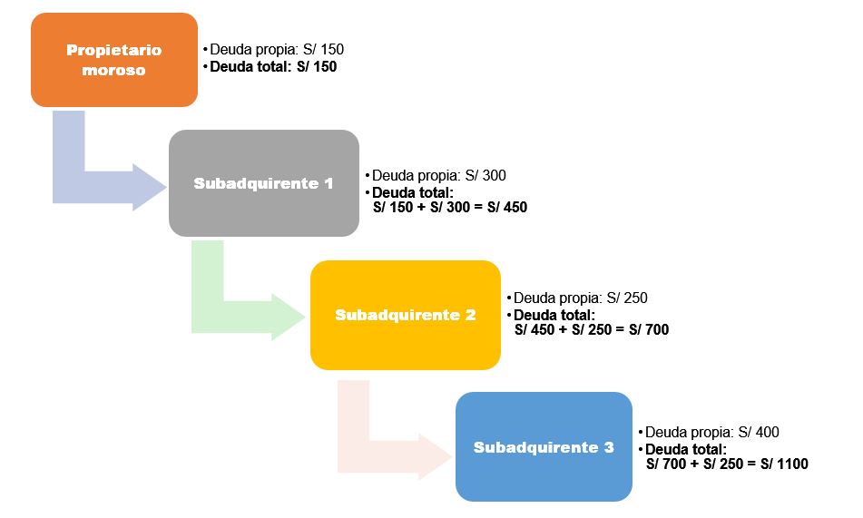 Cabe aclarar que, para que el sub adquirente responda por su propia deuda y la de los transferentes anteriores, todas ellas deben estar publicitadas mediante sucesivos asientos registrales de modificación de la carga. Para tal fin, debería ser posible actualizar registralmente el monto adeudado, lo cual serviría, además, para que los potenciales sub adquirentes adopten decisiones informadas. Por poner un ejemplo, supongamos que la carga se constituye por S/ 200, pero al momento de las tratativas la deuda incrementa en S/ 1000; o viceversa, la carga se constituye por S/ 1000, pero a la fecha de las tratativas la deuda se reduce a S/ 200; en ambos supuestos el análisis costo-beneficio del potencial adquirente sería diferente. Conviene a la junta de propietarios actualizar la deuda cuando esta se incrementa en el tiempo, y al propietario moroso cuando se reduce. Por ello, es importante brindar la posibilidad de que la deuda sea actualizada registralmente como cualquier otra inscripción sobre los predios (descripción de las características físicas, titularidad dominial, cargas y gravámenes, etc.).
