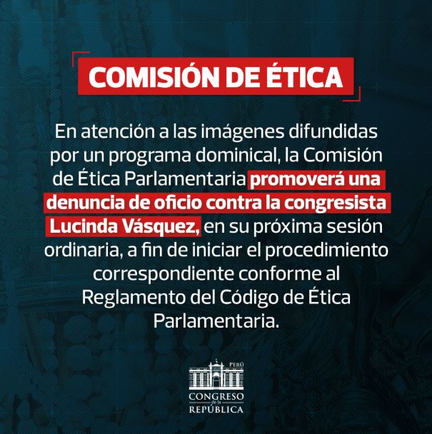 La Comisión de Ética Parlamentaria del Congreso de la República anunció que promoverá una denuncia de oficio contra la congresista Lucinda Vásquez, tras la difusión de un reportaje en un programa dominical que mostraría presuntos actos irregulares en su despacho.