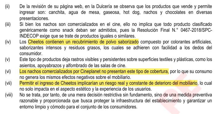 Por su parte, el cine alegó que los Cheetos no son productos similares a los que ofrece en su dulcería, ya que contienen recubrimientos y residuos que pueden ensuciar el mobiliario, a diferencia de los nachos que comercializa. En esa línea, sostuvo que la restricción responde a una medida razonable orientada a proteger la infraestructura del cine y garantizar condiciones adecuadas para los consumidores.