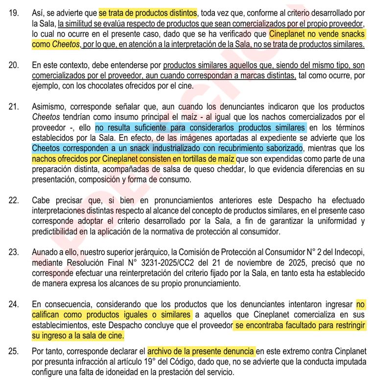 No obstante, el órgano resolutivo concluyó que los Cheetos no constituyen productos iguales o similares a los ofrecidos por Cineplanet, pues presentan diferencias en su composición, presentación y forma de consumo, siguiendo el criterio establecido por la Sala Especializada en Protección al Consumidor.