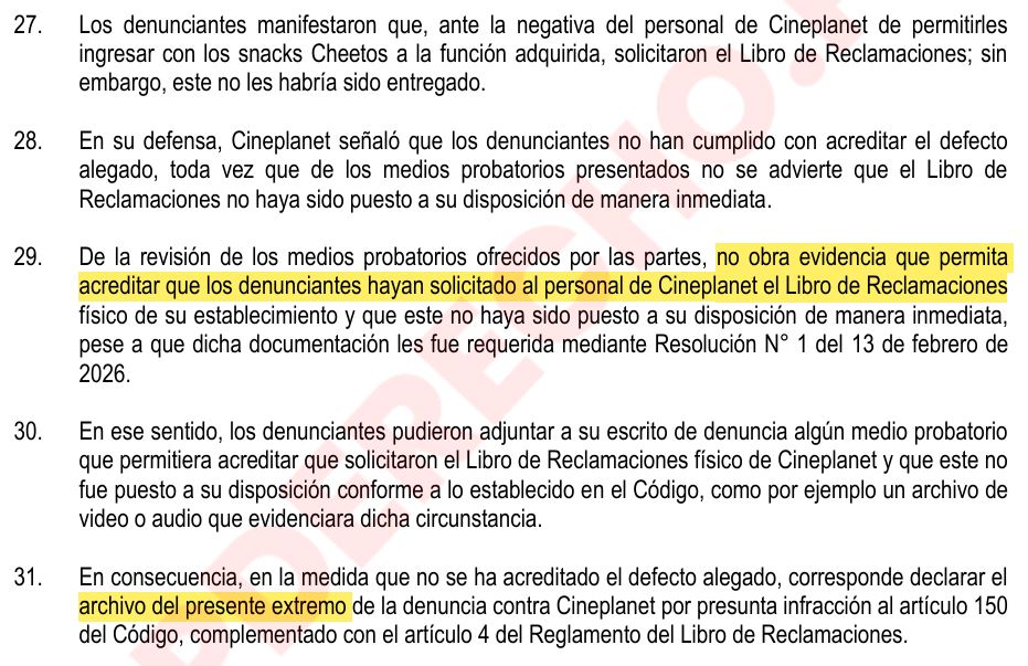 En primera instancia administrativa, el Órgano Resolutivo de Procedimientos Sumarísimos de Protección al Consumidor N.° 3 del Indecopi sancionó a Cineplex S.A. (Cineplanet) con una amonestación por no brindar una respuesta idónea a un reclamo, pero descartó infracciones vinculadas a la restricción de ingreso de alimentos y a la entrega del Libro de Reclamaciones.