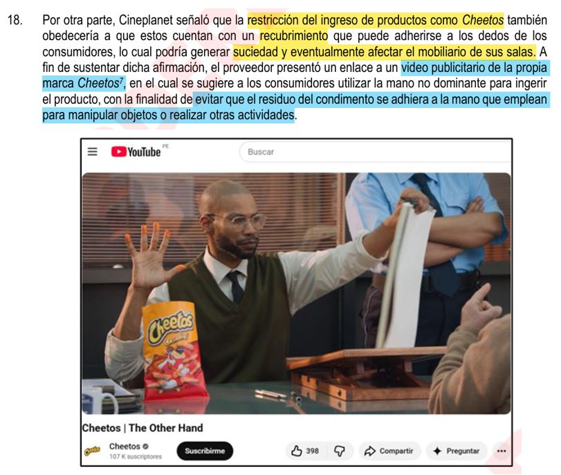 Como parte de su defensa, el cine presentó incluso un video publicitario de la marca Cheetos, en el que se sugiere a los consumidores utilizar una mano distinta para evitar que el producto ensucie los objetos, con el fin de evidenciar que este tipo de snack deja residuos que podrían afectar el mobiliario del cine.