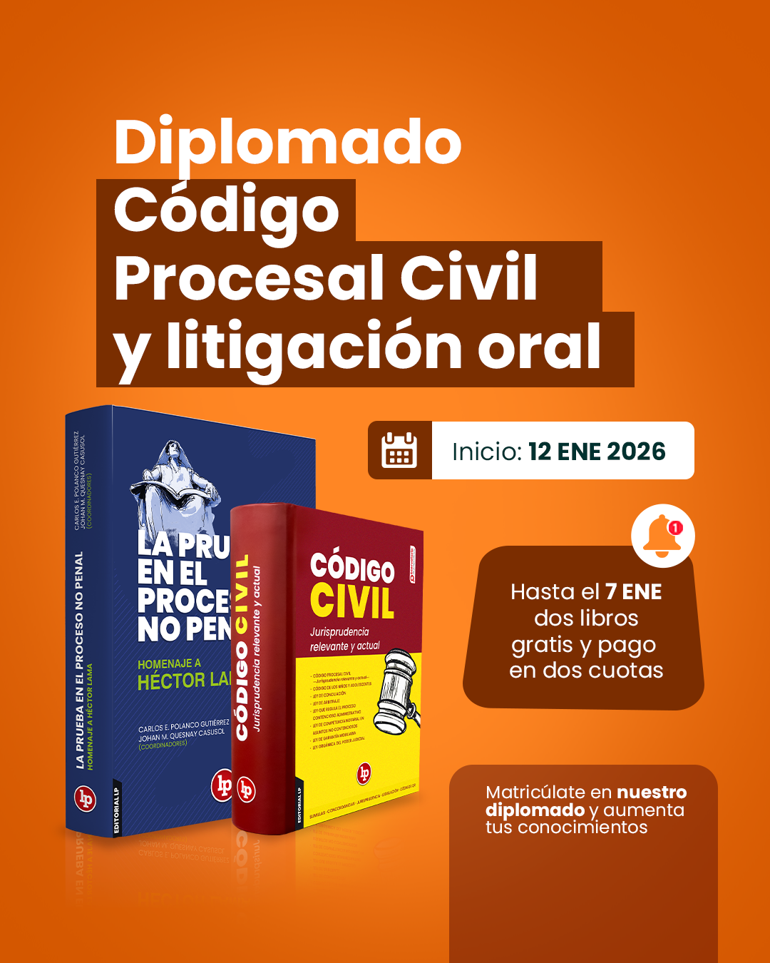 Aprovecha la oportunidad para inscribirte en nuestro Diplomado «Código Procesal Civil y litigación oral» y llévate dos libros gratis hasta el 7 de enero de 2026: