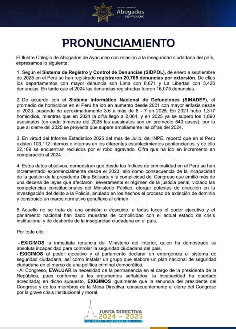 El Ilustre Colegio de Abogados de Ayacucho con relación a la inseguridad ciudadana del país, expresamos lo siguiente: