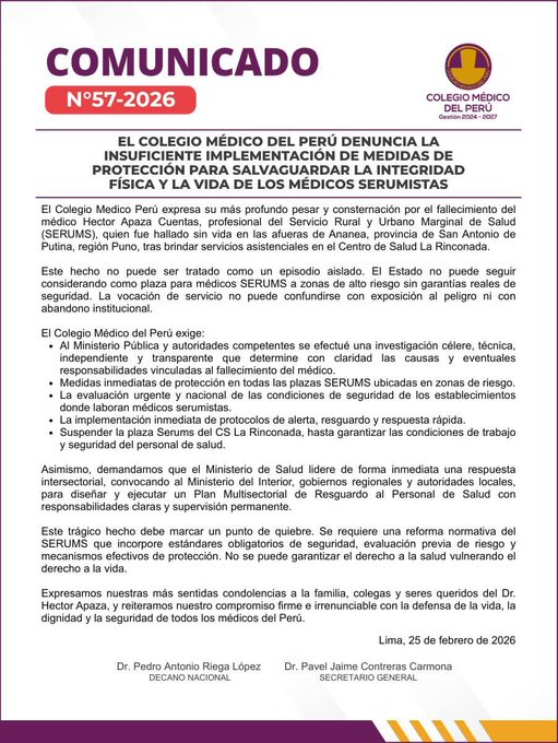 El cuerpo del médico serumista Héctor Herbert Apaza Cuentas, de 28 años, fue encontrado el 24 de febrero en las afueras de Ananea, provincia de San Antonio de Putina, región Puno, luego de haber prestado servicios en el Centro de Salud La Rinconada. El profesional realizaba el Servicio Rural y Urbano Marginal de Salud (SERUMS) y fue hallado en relaves, tras ser reportado como desaparecido.