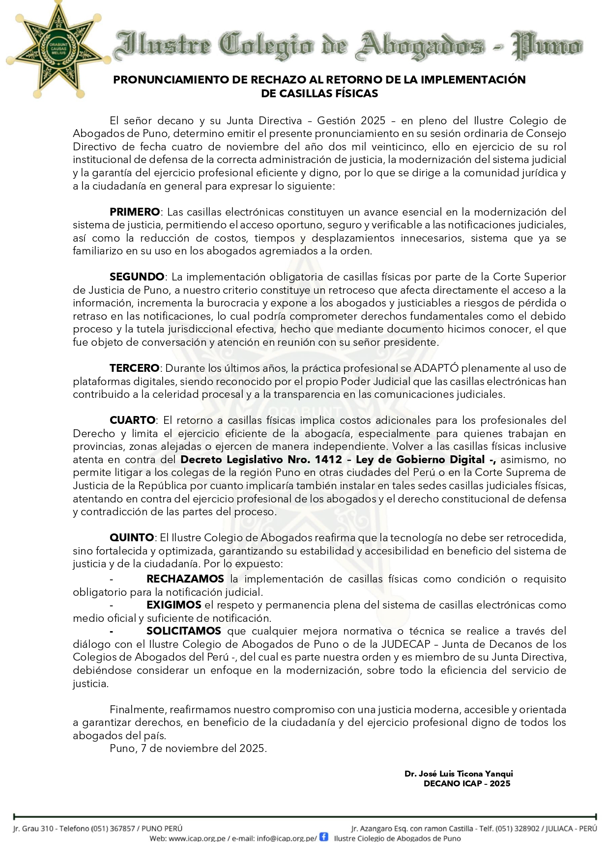 El señor decano y su Junta Directiva – Gestión 2025 – en pleno del Ilustre Colegio de Abogados de Puno, determinan emitir el presente pronunciamiento en su sesión ordinaria de Consejo de Derecho de fecha cuatro de noviembre del año dos mil veinticinco, ello en ejercicio de su rol institucional de defensa de la correcta administración de justicia, la modernización del sistema judicial y la garantía del ejercicio profesional eficiente y digno, por lo que se dirige a la comunidad jurídica y a la ciudadanía en general para expresar lo siguiente:
