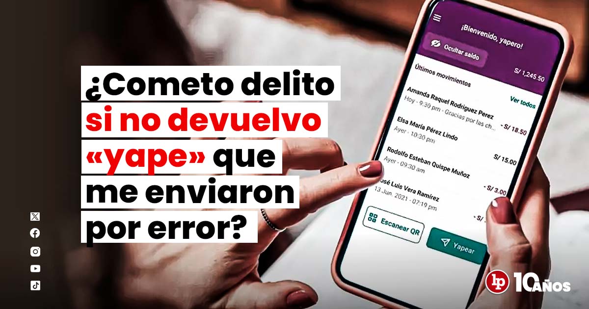 Sí configura delito, sostuvo el penalista Jean Paul Meneses. Explicó que cuando una persona recibe un depósito por error a través de Yape y luego de ser informada del equívoco decide no devolver el dinero, se configura el ánimo de apropiación, es decir, la intención de hacer suyo un bien ajeno.