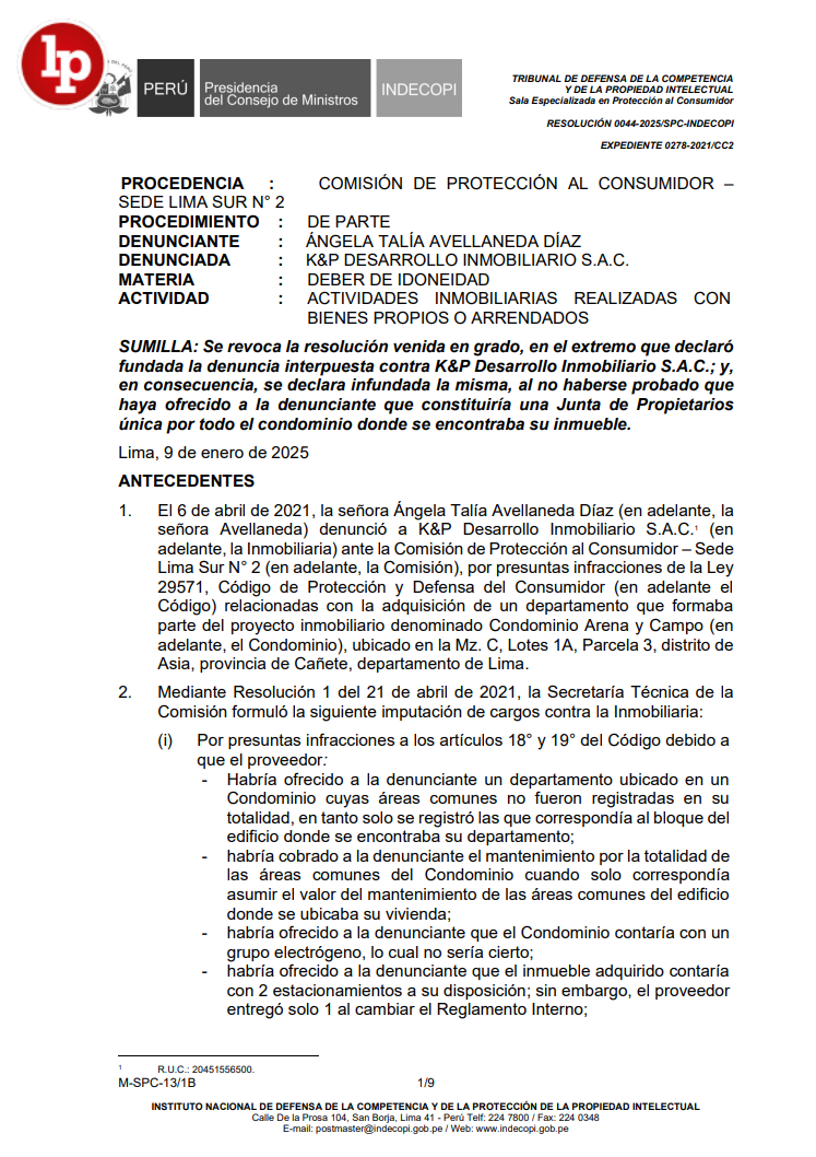 Una compradora denunció ante el Indecopi a una inmobiliaria porque le prometió vivir en un condominio con una sola junta de propietarios, pero al mudarse descubrió que el condominio tenía varias juntas de propietarios.
