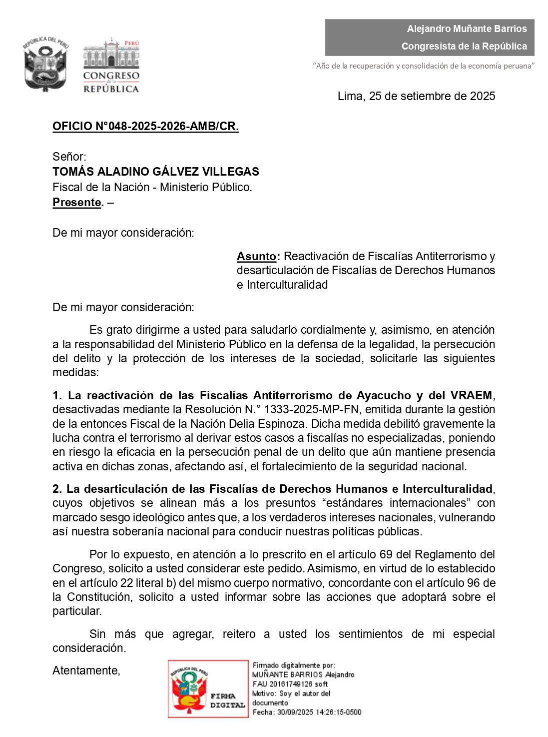 El congresista Alejandro Muñante Barrios solicitó al fiscal de la Nación, Tomás Aladino Gálvez Villegas, la reactivación de las Fiscalías Antiterrorismo de Ayacucho y el VRAEM, desactivadas durante la gestión de la exfiscal Delia Espinoza, al considerar que esta medida debilitó la lucha contra el terrorismo en zonas críticas. Asimismo, pidió la desarticulación de las Fiscalías de Derechos Humanos e Interculturalidad, a las que acusó de responder a un sesgo ideológico contrario a los intereses nacionales.
