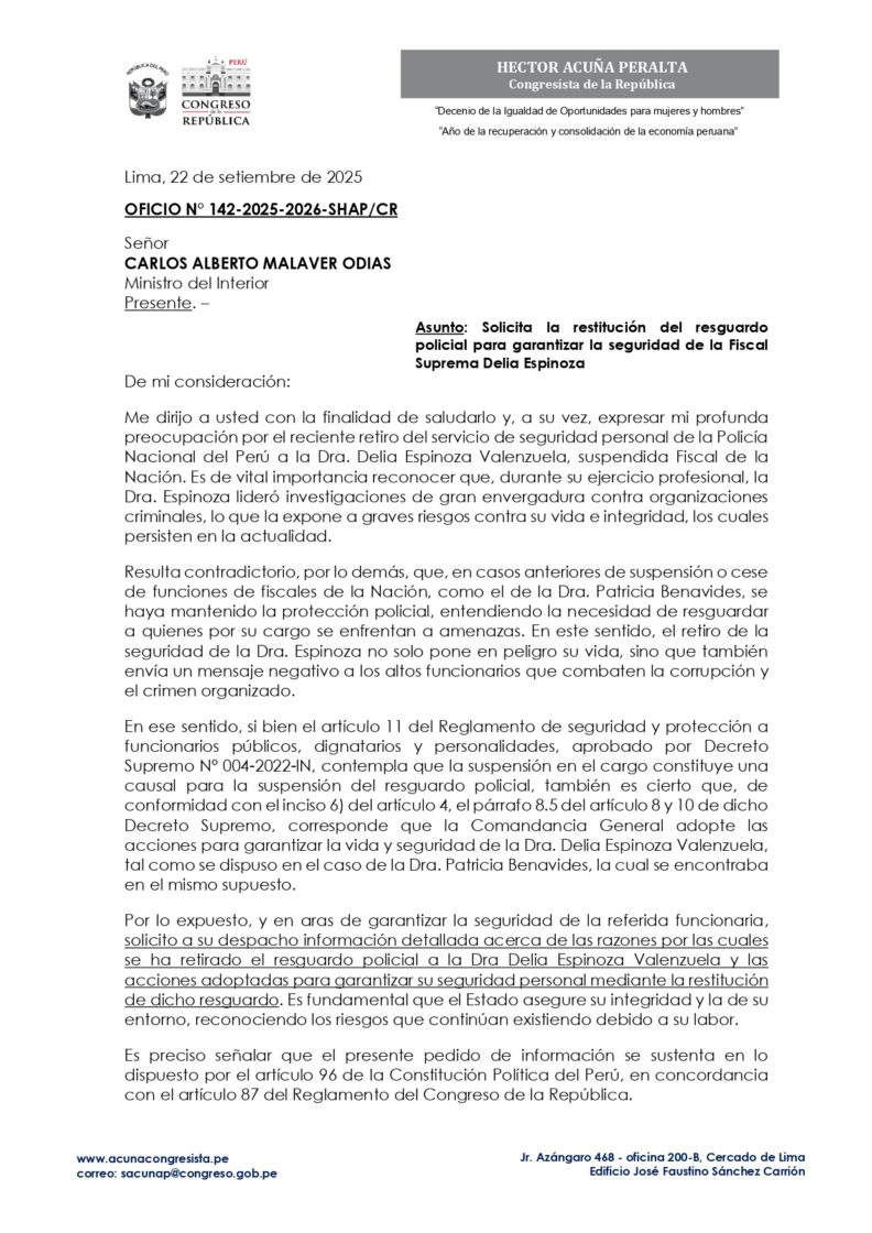 En esa línea, Acuña solicitó al Ministerio del Interior «información detallada acerca de las razones por las cuales se ha retirado el resguardo policial a Delia Espinoza y las acciones adoptadas para garantizar su seguridad personal mediante la restitución de dicho resguardo».