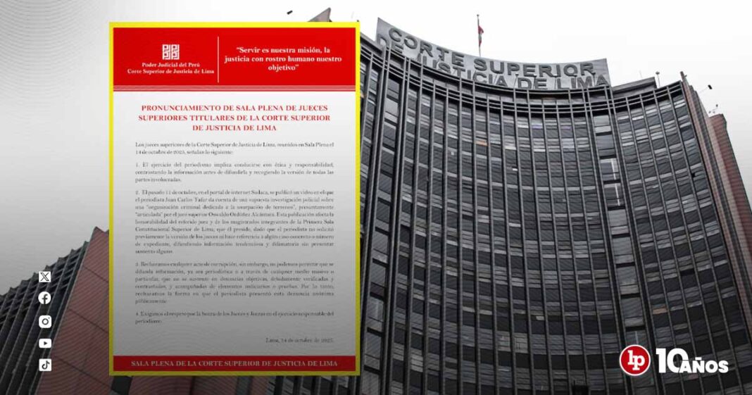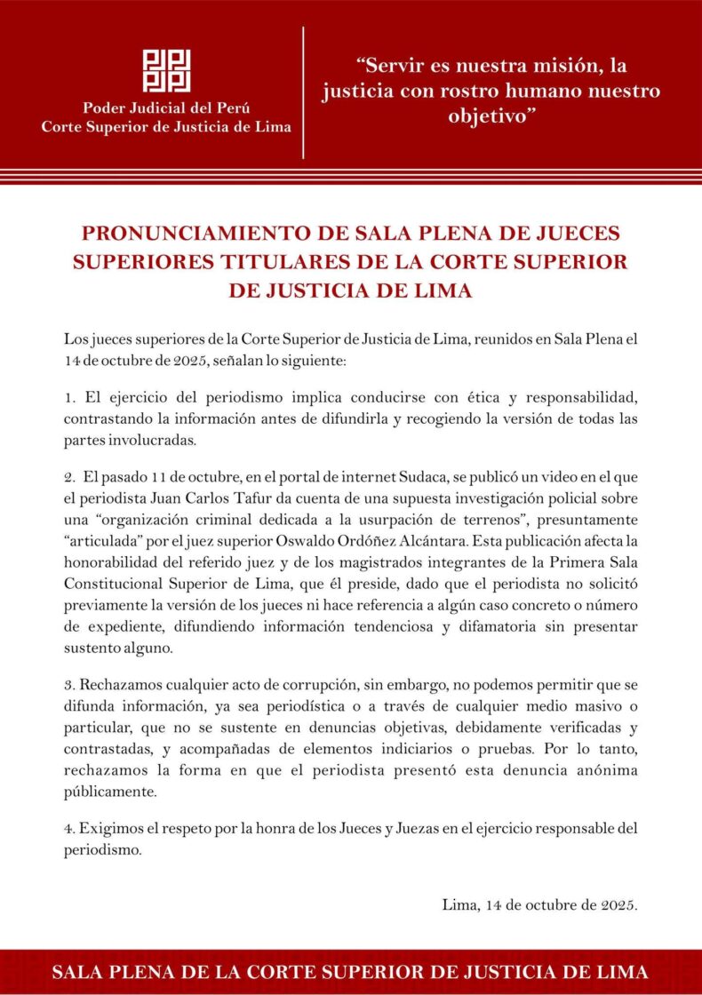En un pronunciamiento emitido tras la sesión de Sala Plena del 14 de octubre, los jueces superiores titulares calificaron como «tendenciosa y difamatoria» la información publicada por el periodista Juan Carlos Tafur, quien dio cuenta de una presunta investigación policial sobre una supuesta red criminal vinculada al magistrado.