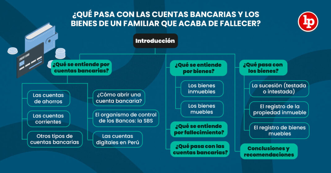 Sumario.- 1. Introducción, 2. ¿Qué se entiende por cuentas bancarias?, 2.1. Las cuentas de ahorros, 2.1.1. Beneficios de las cuentas de ahorros, 2.2. Las cuentas corrientes, 2.2.1. Beneficios de las cuentas corrientes, 2.3. Otros tipos de cuentas bancarias, 2.3.1. Cuentas para trabajadores, 2.3.1.1. Cuentas sueldos, 2.3.1.2. Cuentas CTS, 2.3.2. Cuentas a plazo fijo, 2.3.3. Cuentas en dólares o en monedas extranjeras, 2.4. ¿Cómo abrir una cuenta bancaria?, 2.5. El organismo de control de los Bancos: la SBS, 2.6. Las cuentas digitales en Perú (yape, plin, etc.), 2.6.1. Los beneficios de las cuentas digitales, 3. ¿Qué se entiende por bienes?, 3.1. ¿Qué se entiende por bienes inmuebles?, 3.2. ¿Qué se entiende por bienes muebles?, 4. ¿Qué se entiende por fallecimiento?, 5. ¿Qué pasa con las cuentas bancarias del familiar que acaba de fallecer?, 5.1. Cuentas bancarias, 5.2. Bienes del fallecido, 6. ¿Qué pasa con los bienes del familiar que acaba de fallecer?, 6.1. La sucesión (testada o intestada), 6.1.1. La sucesión en la sociedad de gananciales, 6.1.2. La sucesión en la separación de patrimonios, 6.2. El registro de la propiedad inmueble, 6.3. El registro de bienes muebles, 6.3.1. Bienes muebles no registrables en SUNARP, 7. Conclusiones y recomendaciones, 8. Bibliografía.