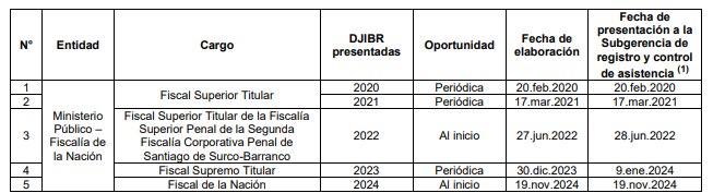 El documento, fechado este último 7 de octubre, señala que la evaluación abarcó las Declaraciones Juradas de Ingresos y de Bienes y Rentas (DJIBR) presentadas en el periodo de febrero de 2020 a noviembre de 2024, dentro del cual Espinoza ocupó los puestos de fiscal superior titular, fiscal superior titular de la Fiscalía Superior Penal de la Segunda Fiscalía Corporativa Penal de Santiago de Surco, fiscal supremo titular y fiscal de la Nación.