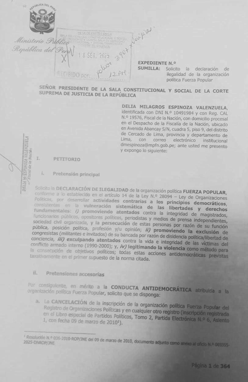 La fiscal de la Nación, Delia Espinoza, presentó ante la Sala Constitucional y Social de la Corte Suprema una solicitud para que el partido político Fuerza Popular sea declarado ilegal, por supuestamente haber incurrido en «conducta antidemocrática». El pedido se sustenta en el artículo 14 de la Ley 28094 – Ley de Organizaciones Políticas.