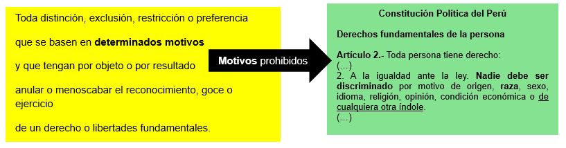 El que, por sí o mediante terceros, realiza actos de distinción, exclusión, restricción o preferencia que anulan o menoscaban el reconocimiento, goce o ejercicio de cualquier derecho de una persona o grupo de personas reconocido en la ley, la Constitución o en los tratados de derechos humanos de los cuales el Perú es parte, basados en motivos raciales, religiosos, nacionalidad, edad, sexo, orientación sexual, identidad de género, idioma, identidad étnica o cultural, opinión, nivel socio económico, condición migratoria, discapacidad, condición de salud, factor genético, filiación, o cualquier otro motivo, será reprimido con pena privativa de libertad no menor de dos ni mayor de tres años, o con prestación de servicios a la comunidad de sesenta a ciento veinte jornadas.