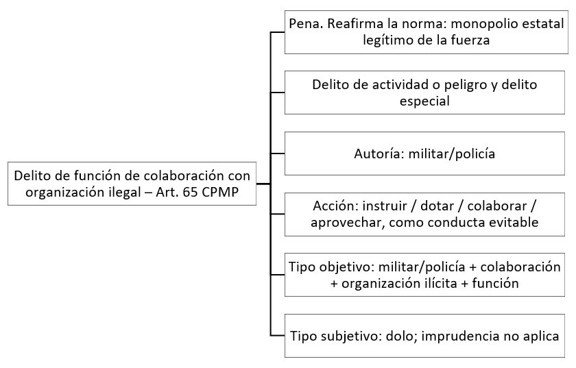 El artículo 65 del Código Penal Militar Policial – Decreto Legislativo 1094 – establece el delito de “colaboración con organización ilegal” que indica: