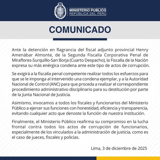 Ante la detención en flagrancia del fiscal adjunto provincial Henry Amenábar Almonte, de la Segunda Fiscalía Corporativa Penal de Miraflores-Surquillo-San Borja (Cuarto Despacho), la Fiscalía de la Nación expresa su más enérgica condena ante este tipo de actos de corrupción. Se exigirá a la fiscalía penal competente realizar todos los esfuerzos para que se le imponga al intervenido una condena ejemplar, y a la Autoridad Nacional de Control (ANC), que proceda a realizar el correspondiente procedimiento administrativo disciplinario para su destitución por parte de la Junta Nacional de Justicia.