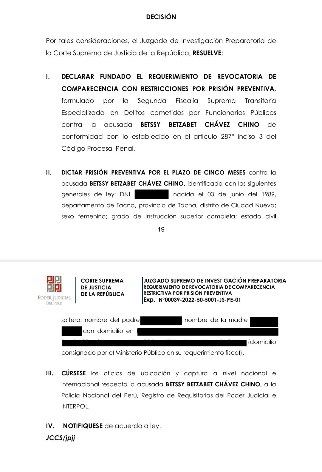 El juez Juan Carlos Checkley Soria revocó la comparecencia con restricciones impuesta a la expremier Betssy Chávez, y en su lugar dictó prisión preventiva por 5 meses y ordenó su captura nacional e internacional.