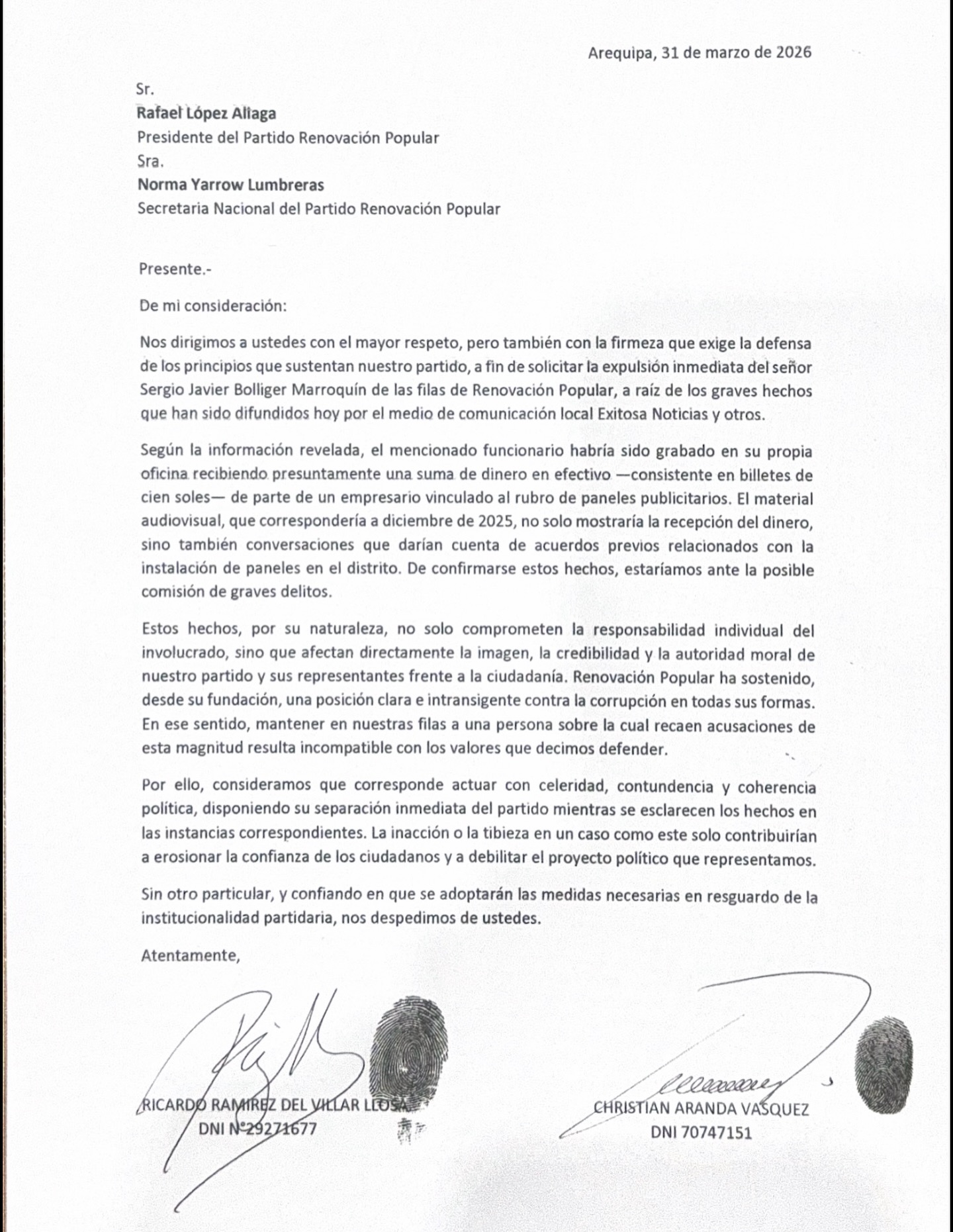 El partido Renovación Popular informó mediante un comunicado la suspensión de la afiliación de Sergio Bolliger. En el pronunciamiento se precisa que la medida responde al conocimiento de supuestos actos ilícitos contemplados en el artículo 6, infracciones graves, inciso 2 de nuestro Reglamento de Ética y Disciplina.