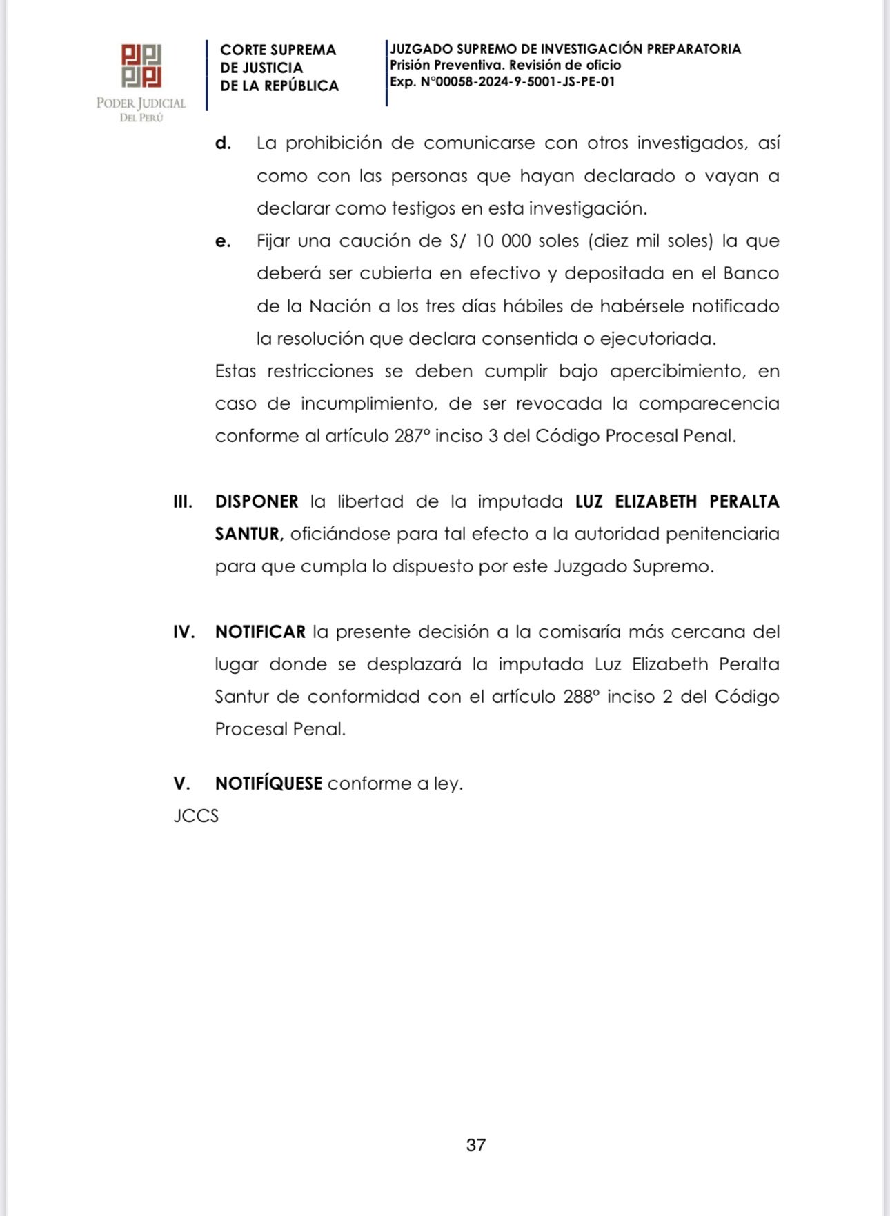 La medida, sin embargo, prohíbe a Peralta Santur comunicarse con otros investigados, así como con personas que hayan declarado o tengan que declarar como testigos del caso. Asimismo, fijó una caución de S/10 000 que deberá abonar a los tres días de notificarse la resolución.