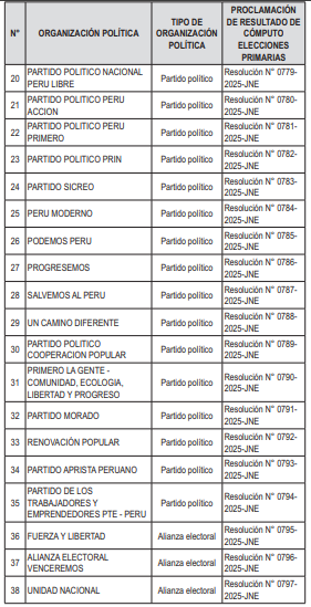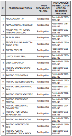 VISTAS: Las Resoluciones N° 0760-2025-JNE, N° 0761-2025-JNE, N° 0762-2025-JNE, N° 0763-2025-JNE, N° 0764-2025-JNE, N° 0765-2025-JNE, N° 0766-2025- JNE, N° 0767-2025-JNE, N° 0768-2025-JNE, N° 0769- 2025-JNE, N° 0770-2025-JNE, N° 0771-2025-JNE, N° 0772-2025-JNE, N° 0773-2025-JNE, N° 0774-2025-JNE, N° 0775-2025-JNE, N° 0776-2025-JNE, N° 0777-2025- JNE, N° 0778-2025-JNE, N° 0779-2025-JNE, N° 0780- 2025-JNE, N° 0781-2025-JNE, N° 0782-2025-JNE, N° 0783-2025-JNE, N° 0784-2025-JNE, N° 0785-2025-JNE, N° 0786-2025-JNE, N° 0787-2025-JNE, N° 0788-2025- JNE, N° 0789-2025-JNE, N° 0790-2025-JNE, N° 0791- 2025-JNE, N° 0792-2025-JNE, N° 0793-2025-JNE, N° 0794-2025-JNE, N° 0795-2025-JNE, N° 0796-2025-JNE y N° 0797-2025-JNE, que contienen la proclamación de los resultados de cómputo de las elecciones primarias de las Elecciones Generales 2026; así como la Resolución N° 0745-2025-JNE, emitida en el Expediente N° EPEG.2026000046; y