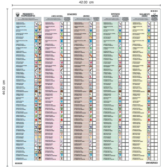 La cédula se encuentra dividida proporcionalmente en cinco columnas: Presidente y Vicepresidentes, Senadores a nivel nacional, Senadores a nivel regional, Diputados y Parlamento Andino; en la esquina superior derecha presenta un código de barras impreso en color negro.