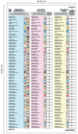 la cédula para elegir Presidente y Vicepresidentes, además de senadores, diputados y representantes ante el Parlamento Andino;