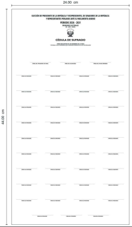 1.2 El tamaño mínimo de la cédula de sufragio será de 24.00 cm. de ancho x 21.00 cm. de largo y de acuerdo al número de organizaciones políticas participantes; el largo se incrementará proporcionalmente hasta un máximo de 44.00 cm.