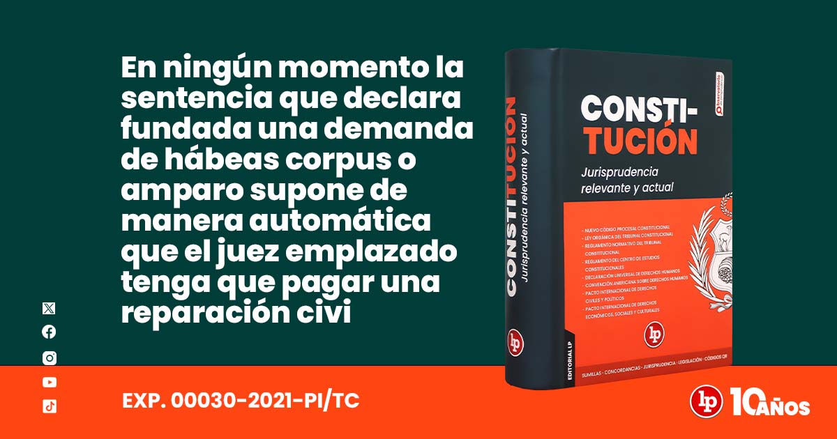 Fundamento destacado: 28. Asimismo, este Tribunal Constitucional considera que la posibilidad de instaurar a futuro un proceso por responsabilidad civil a los jueces que suscribieron las resoluciones que dieron lugar a sentencias constitucionales fundadas, no es razón suficiente para estimar la demanda en este extremo. En ningún momento se afirma que la emisión de la sentencia que declara fundada la demanda de habeas corpus y amparo supone, de por sí y automáticamente, que el juez tenga que pagar una reparación civil. Antes bien, si eventualmente el juez es demandado, al tratarse efectivamente de un proceso seguido en su contra, tendrá la oportunidad de ser emplazado y defenderse en el respectivo proceso ordinario con todas las garantías correspondientes; por lo que no se debe perder de vista, bajo ninguna circunstancia, la naturaleza eminentemente reparatoria de los procesos de tutela.