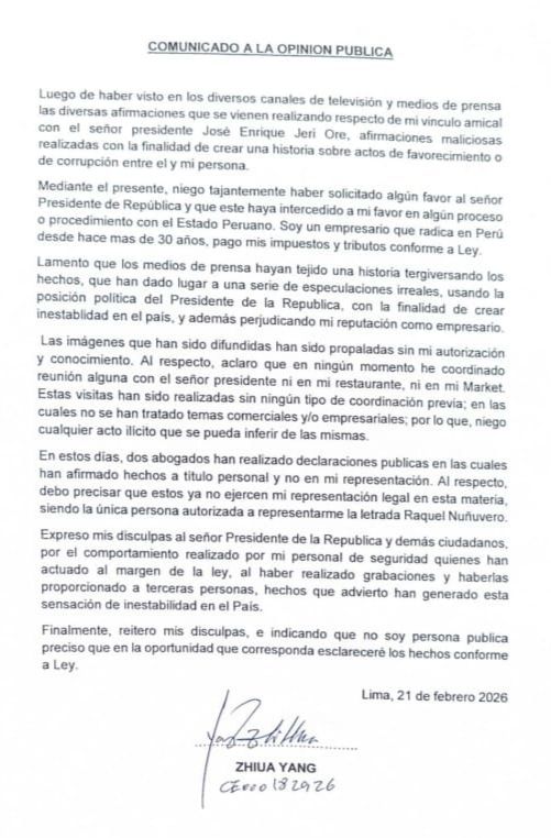 Luego de haber visto en los diversos canales de televisión y medios de prensa las diversas afirmaciones que se vienen realizando respecto de mi vinculo amical con el señor presidente José Enrique Jerí Ore, afirmaciones maliciosas realizadas con la finalidad de crear una historia sobre actos de favorecimiento o de corrupción entre el y mi persona.