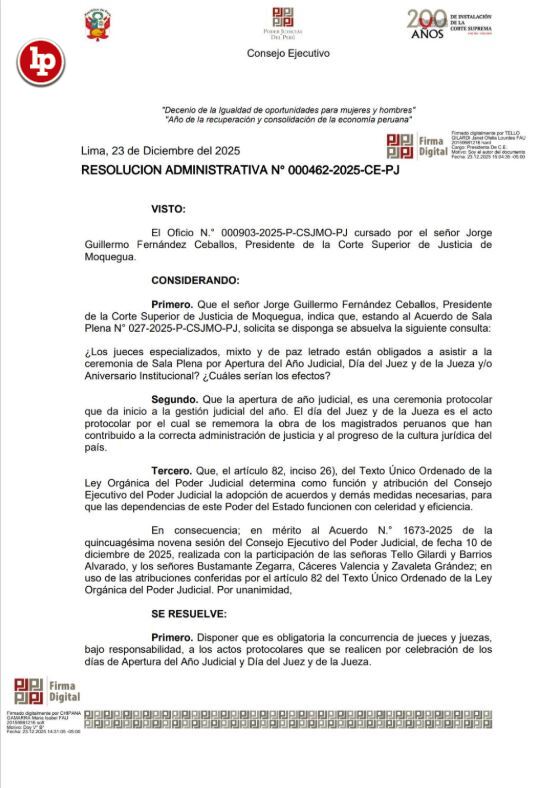 La Resolución Administrativa N.° 000462-2025-CE-PJ, emitida por el Consejo Ejecutivo del Poder Judicial a partir de una consulta de la Corte Superior de Justicia de Moquegua, precisa que es obligatoria la asistencia de jueces y juezas —bajo responsabilidad— a los actos protocolares por la Apertura del Año Judicial y el Día del Juez y de la Jueza, y dispone que dicha decisión sea notificada a las dependencias de la Corte Suprema, presidencias de Cortes Superiores y a la Gerencia General del Poder Judicial para su conocimiento y fines correspondientes.