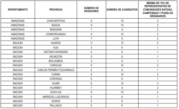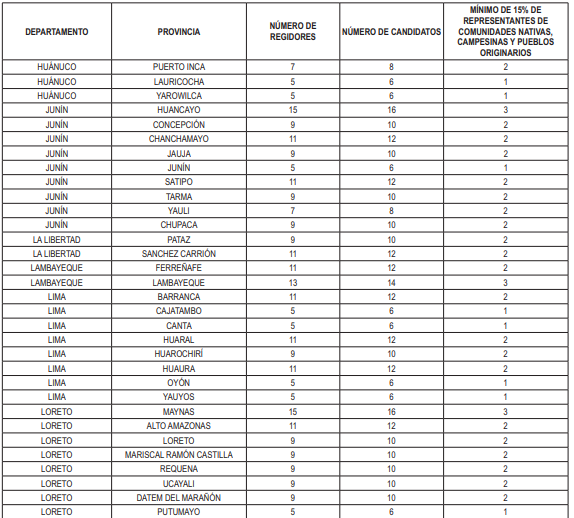 Además, para la aplicación de la cuota de representantes de comunidades nativas, campesinas y pueblos originarios en las Elecciones Municipales 2026 se establece el número de candidatos equivalentes al porcentaje dispuesto por ley, en las provincias en las que existen.