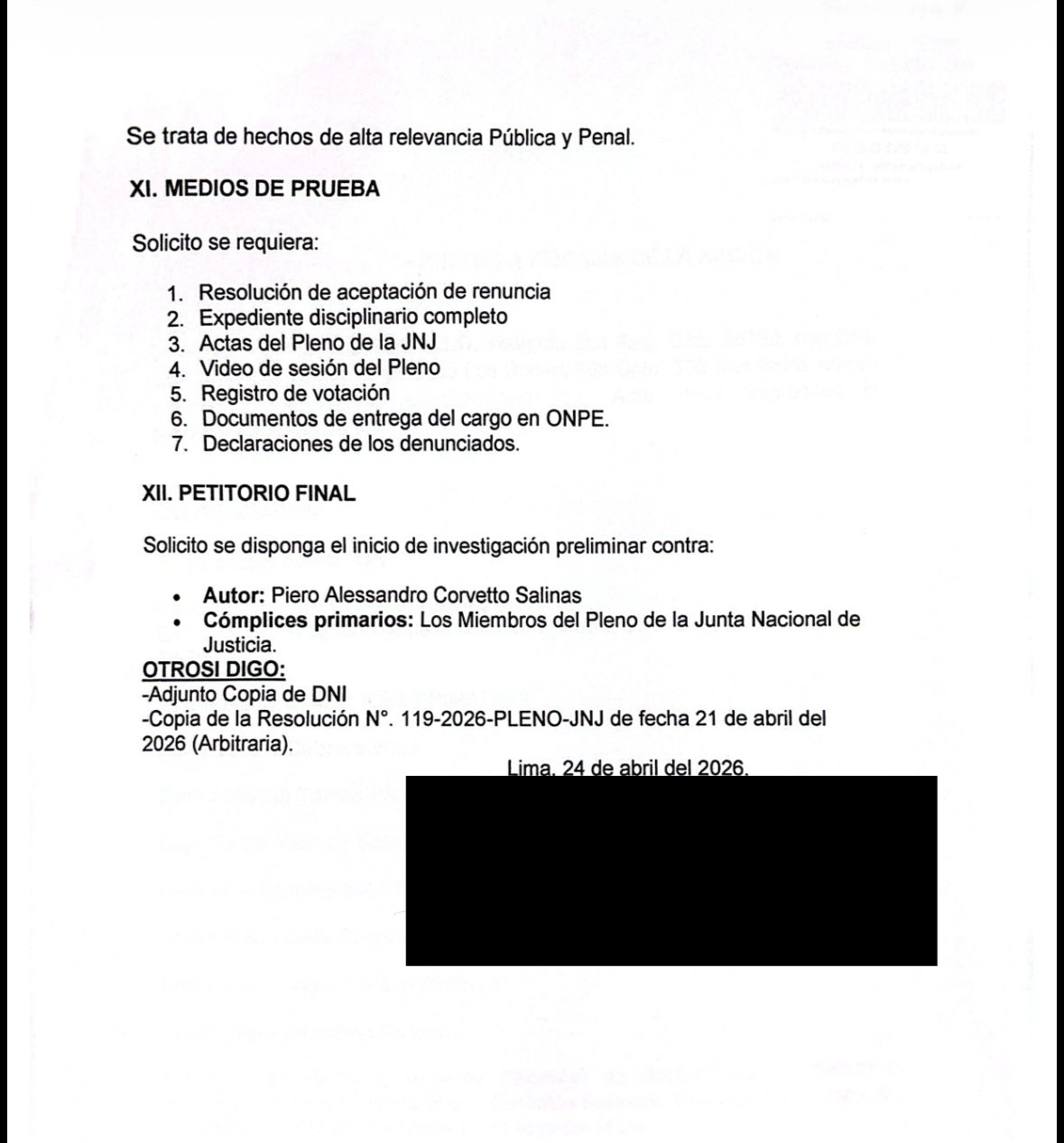 Por último, el documento consigna como medios de prueba la resolución de aceptación de renuncia, el expediente disciplinario completo, las actas del Pleno de la JNJ, el video de sesión del Pleno, el registro de votación, los documentos de entrega del cargo en ONPE y las declaraciones de los denunciados.