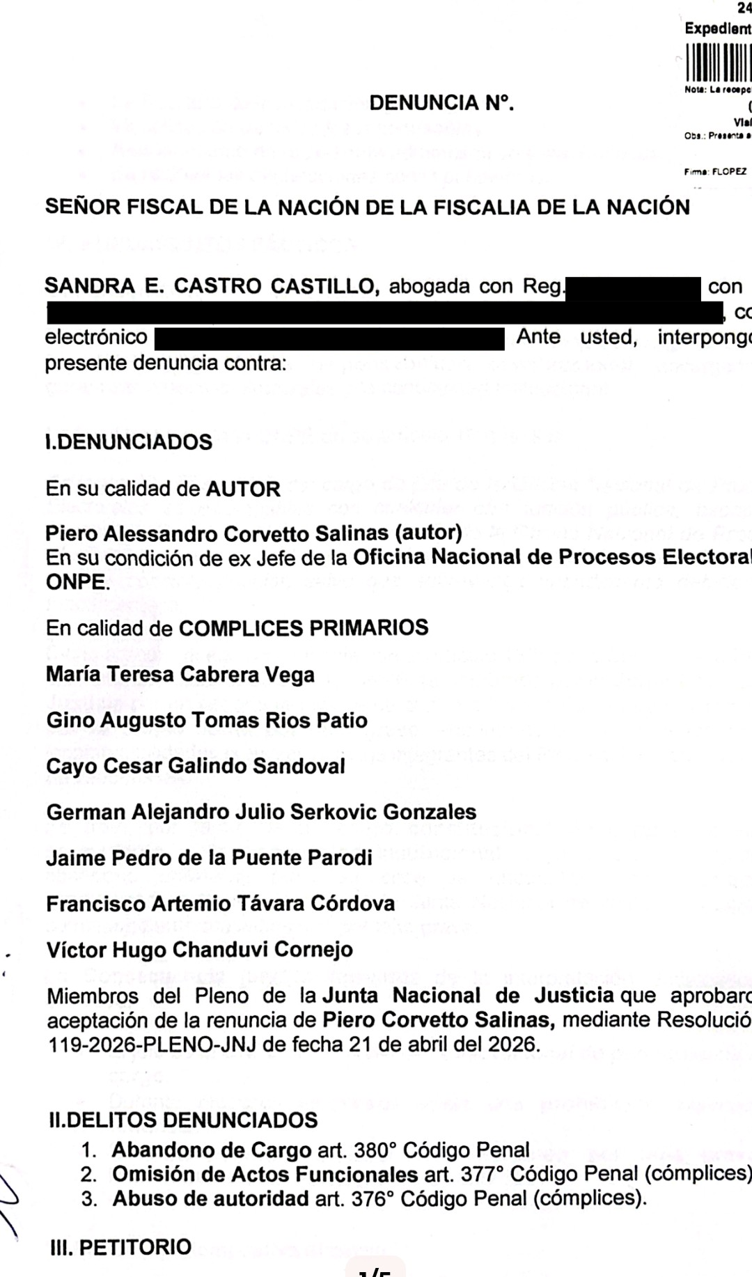 La exfiscal Sandra Castro denunció ante la Fiscalía de la Nación a Piero Corvetto y, en condición de cómplices primarios, a todos los miembros de la Junta Nacional de Justicia por los presuntos delitos de abandono de cargo, omisión de funciones y abuso de autoridad.