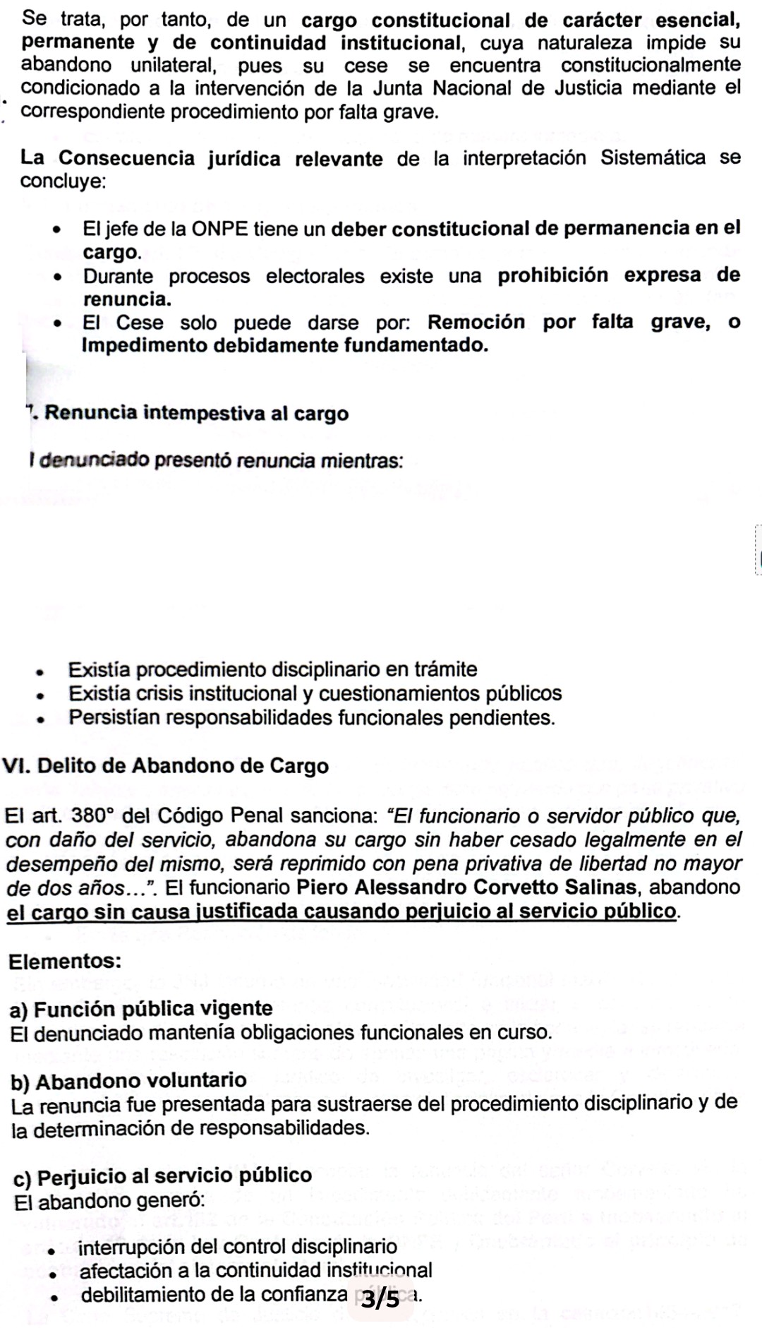 En cuanto al delito de abandono de cargo previsto en el artículo 380 del Código Penal, la denunciante señala que el exfuncionario habría dejado el puesto sin causa justificada y con afectación al servicio público.