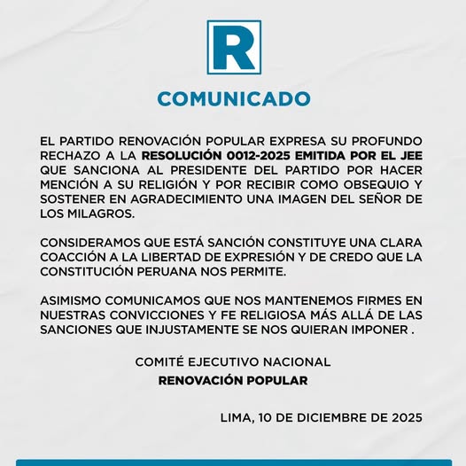 Al respecto, el Comité Ejecutivo Nacional de Renovación Popular emitió un comunicando expresando su «profundo rechazo» a la resolución del JEE. «Consideramos que está sanción constituye una clara coacción a la libertad de expresión y de credo que la constitución peruana nos permite», señaló.