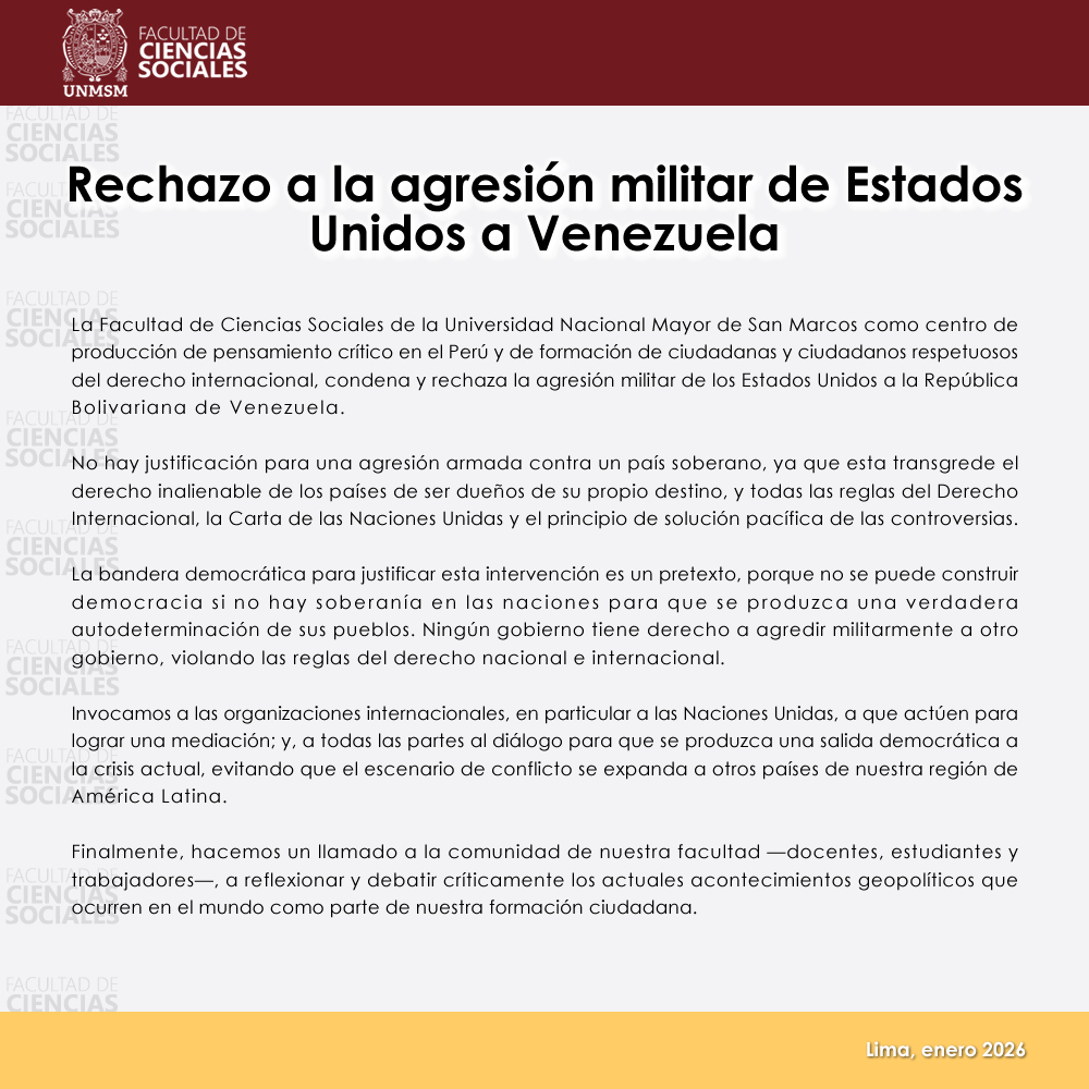 La Facultad de Ciencias Sociales de la Universidad Nacional Mayor de San Marcos como centro de producción de pensamiento crítico en el Perú y de formación de ciudadanas y ciudadanos respetuosos del derecho internacional, condena y rechaza la agresión militar de los Estados Unidos a la República Bolivariana de Venezuela.