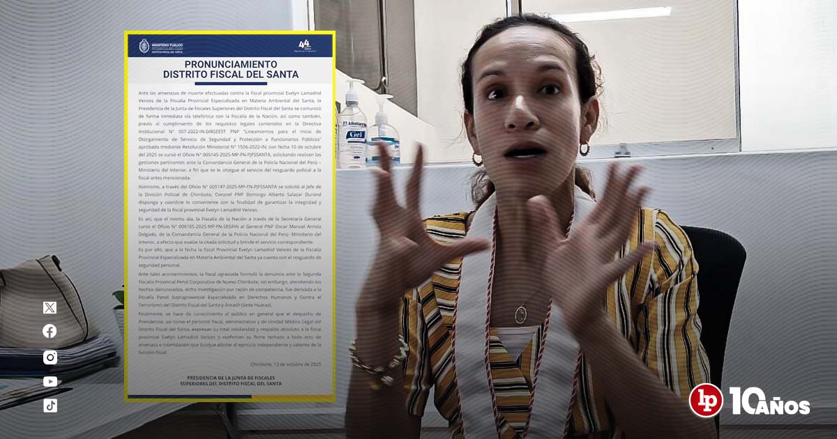 Ante las amenazas de muerte efectuadas contra la fiscal provincial Evelyn Lamadrid Vences de la Fiscalía Provincial Especializada en Materia Ambiental del Santa, la Presidencia de la Junta de Fiscales Superiores del Distrito Fiscal del Santa se comunicó de forma inmediata vía telefónica con la Fiscalía de la Nación, así como también, previo al cumplimiento de los requisitos legales contenidos en la Directiva Institucional 007-2022-IN-DIRSEEST PNP «Lineamientos para el Inicio de Otorgamiento de Servicio de Seguridad y Protección a Funcionarios Públicos» aprobada mediante Resolución Ministerial 1506-2022-IN; con fecha 10 de octubre del 2025 se cursó el Oficio 005145-2025-MP-FN-PJFSSANTA, solicitando realicen las gestiones pertinentes ante la Comandancia General de la Policía Nacional del Perú – Ministerio del Interior, a fin que se le otorgue el servicio del resguardo policial a la fiscal antes mencionada.