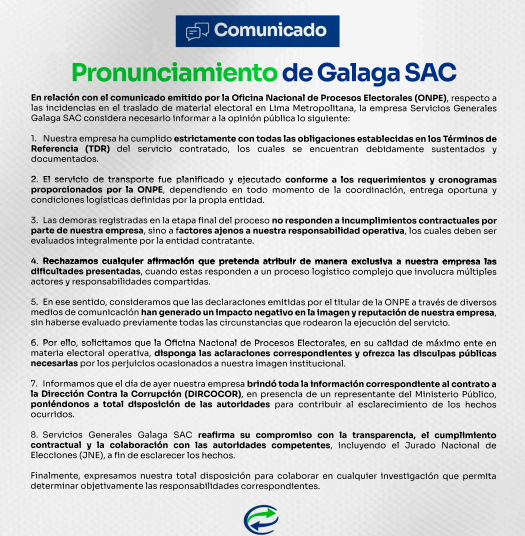 La empresa Servicios Generales Galaga SAC solicitó a la Oficina Nacional de Procesos Electorales (ONPE) que emita disculpas públicas por las declaraciones que la responsabilizan de fallas en el traslado de material electoral. El pedido se formula tras considerar que dichas afirmaciones han afectado su imagen institucional y reputación en el contexto de la jornada electoral.