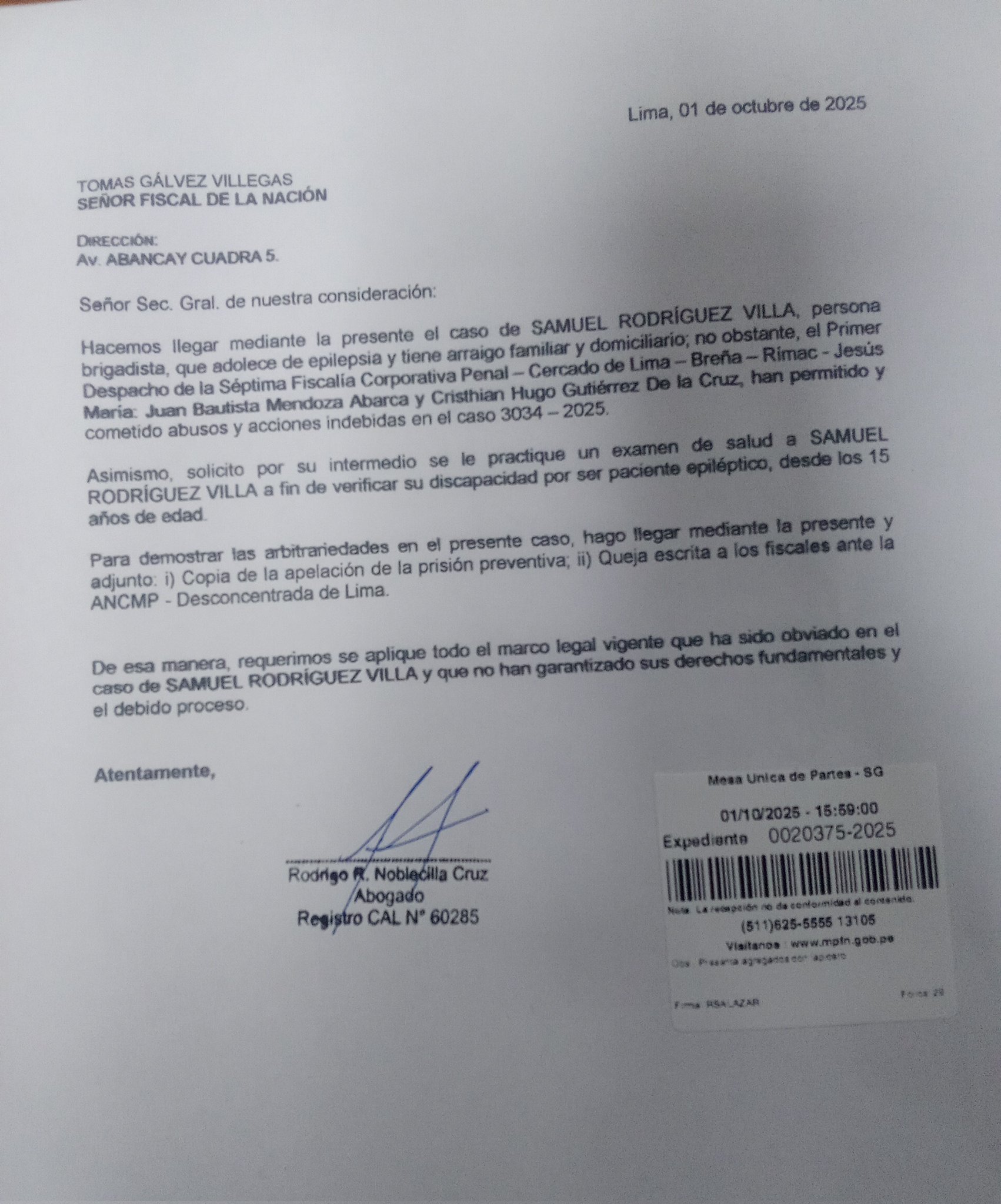 De acuerdo al abogado Rodrigo Noblecilla Cruz, su defendido Samuel Rodríguez Villa «adolece de epilepsia y tiene arraigo familiar y domiciliario». Por ello, pide a Gálvez que se disponga un «examen de salud a fin de verificar su discapacidad por ser paciente epiléptico desde los 15 años de edad».