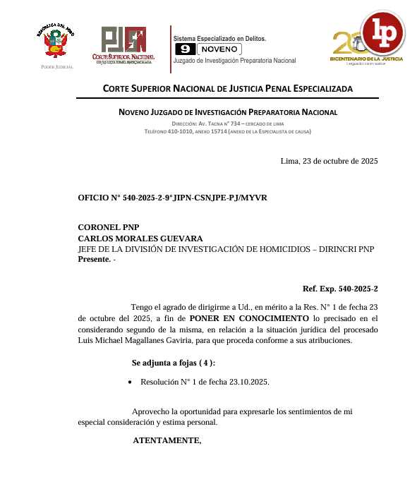 Este jueves 23, el suboficial Luis Magallanes quedó libre tras el cumplimiento de su prisión preventiva y no contar con un pedido de prisión preventiva. Asimismo, el Noveno Juzgado de Investigación Preparatoria Nacional programó para el 4 de noviembre, a las 11:00 a. m., la audiencia en la que evaluará el pedido de comparecencia con restricciones e impedimento de salida del país.
